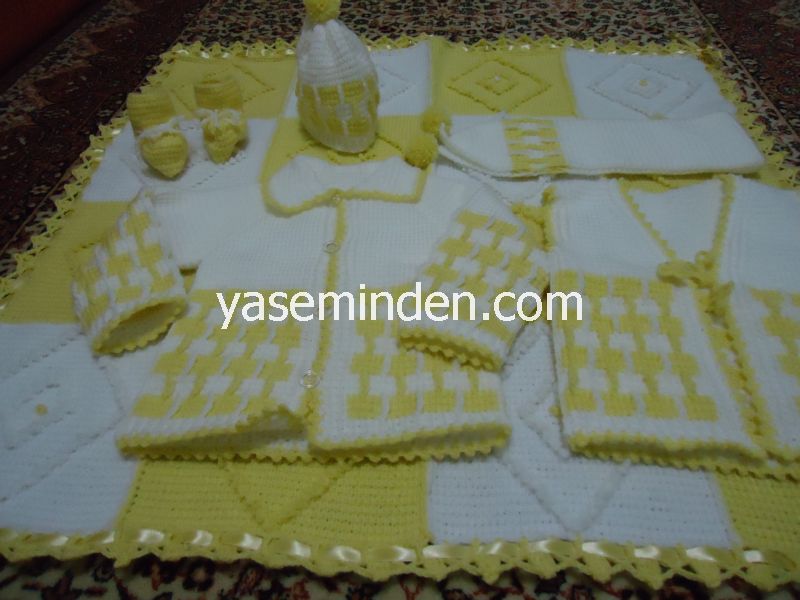 Takımda battaniye, hırka, yelek, şapka, atkı, patik bulunmaktadır.