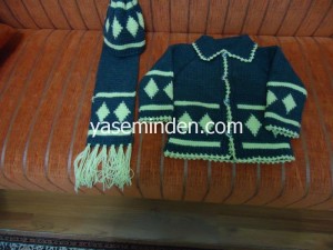 Takımda hırka, yelek, şapka, atkı bulunmaktadır.